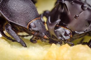 Xylotrupes ulysses australicus can reach a length of 3.5–7 centimetres (1.4–2.8 in). As usual with rhinoceros beetles there is a great difference between the genders. Males are larger than females. They have two chitinous bifurcated horns, a thick thoracic horn and a smaller cephalic horn, which they use to eliminate their rivals during the mating period. These beetles are shiny dark red, dark brown, or black in coloration. The eyes are located on each side of the head. When disturbed these beetles make a hissing noise, produced by rubbing the tip of the abdomen against the edge the elytra.